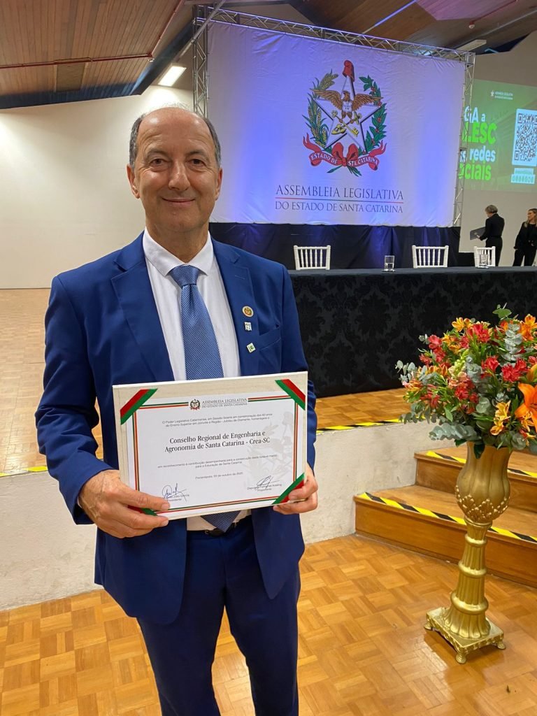 O CREA-SC foi homenageado pela Assembleia Legislativa do Estado de Santa Catarina (Alesc) durante sessão solene realizada no dia 3 de outubro no Centro de Convenções da Univille, em Joinville, em comemoração aos 60 anos do Ensino Superior em Joinville e Região. A homenagem reconhece o papel histórico e a parceria institucional do CREA-SC na consolidação da educação superior no Norte de Santa Catarina, contribuindo para o fortalecimento da engenharia, agronomia e geociências no estado. O Conselho foi representado pelo Eng. Gilson João dos Santos, diretor de Estratégia e Inovação, que recebeu a honraria em nome da Presidência.